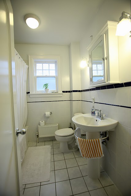 Goodbye dark grout lines! Goodbye white shower curtain! Hello little baskets! Hello ceiling light! Hello cabana stripe hand towels and navy carpet!